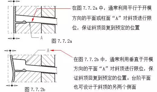 在斜顶机构中,为了保证斜顶工作稳定、可靠,应该注意以下几点:(A)斜顶的刚性。增强斜顶刚性一般采用:1.在结构允许的情况下,尽量加大斜顶横断面尺寸。(参见第七章7.2节)2.在可以满足侧向出模的情况下,斜顶的斜度角“A”尽量选用较小角度,斜角A一般不大于20°,并且将斜顶的侧向受力点下移,如增加图7.7.1a中的镶块2,同时镶块可以具有较高的硬度,提高 模具 的寿命。(B)斜顶横向移动空间。如图7.7.1a所示尺寸“D”,为了保证斜顶在顶出时不与胶件上的其它结构发生干涉,应充分考虑斜顶的侧向分模距离、斜顶的斜度角“A”,以保证有足够的横向移动空间“D”。(C)斜顶在开模方向的复位。为了保证合模后,斜顶回复到预定的位置,一般采用下面的结构形式。如图7.7.2a;7.7.2b。